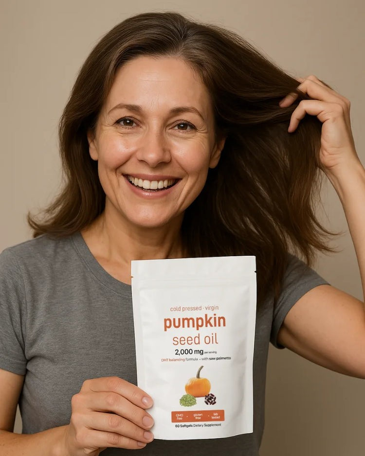 Rich in zinc and essential fatty acids, pumpkin seed oil helps block DHT production naturally while nourishing hair follicles for stronger, healthier growth.
